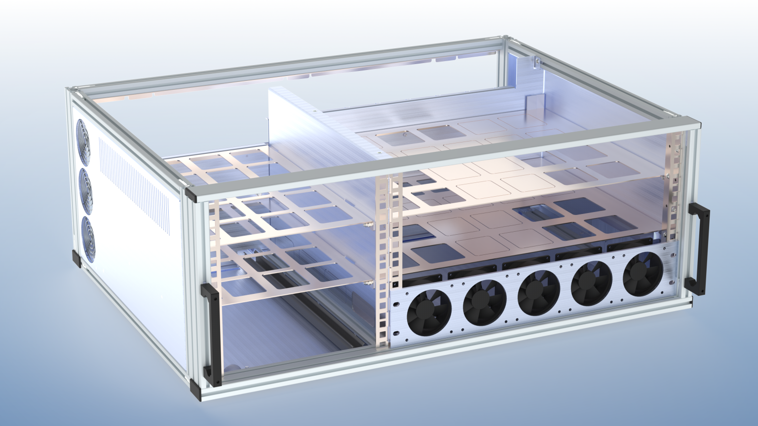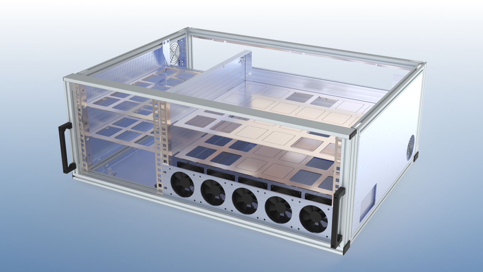 - Nur durch die Verwendung von Kugelrollen und speziell konstruierten Aufnahmeblechen für die 9,5" und 19" Einheiten war es überhaupt möglich, die gewünschten Komponenten im dem stark begrenzten Bauraum unterzubringen.